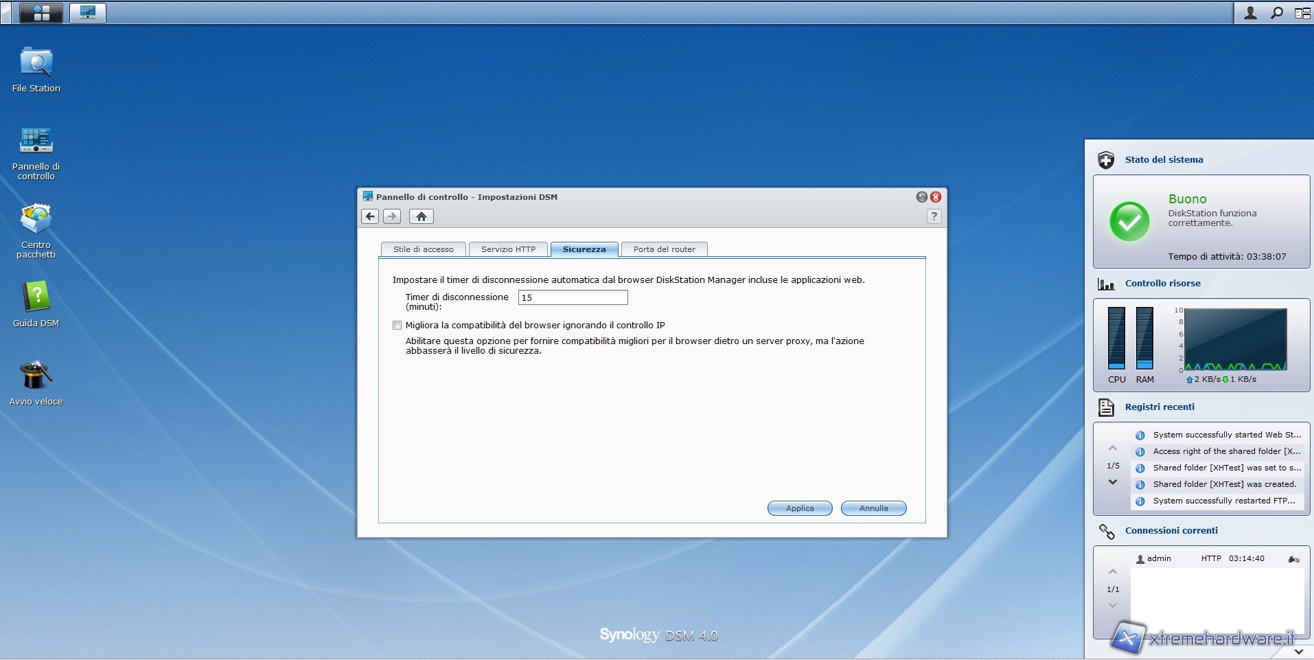 La scheda “sicurezza” permette di settare il tempo di disconnessione automatica dal browser DiskStation dopo inattività su di esso.