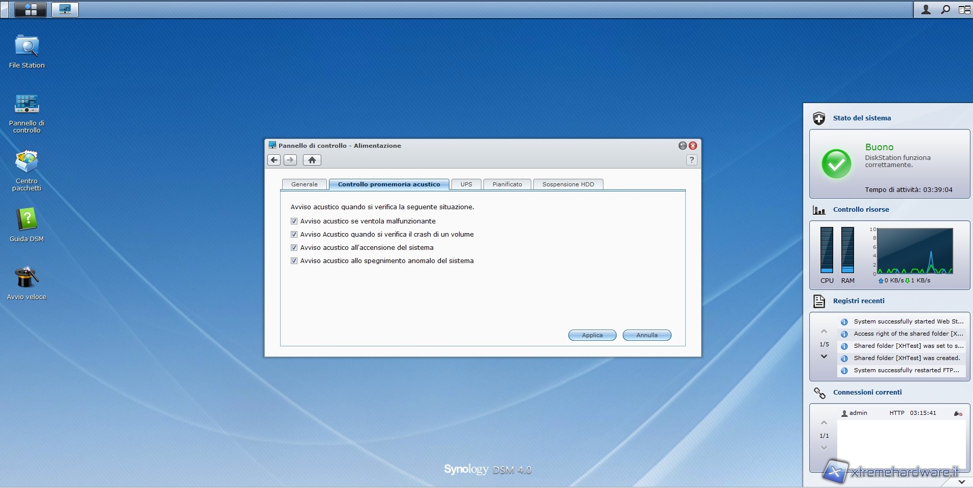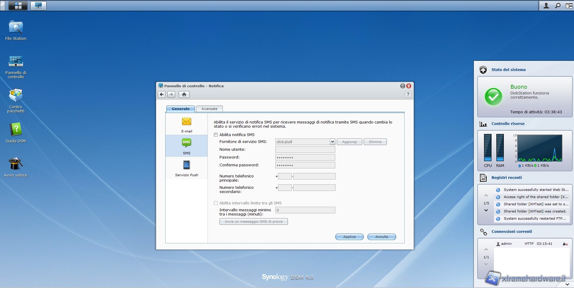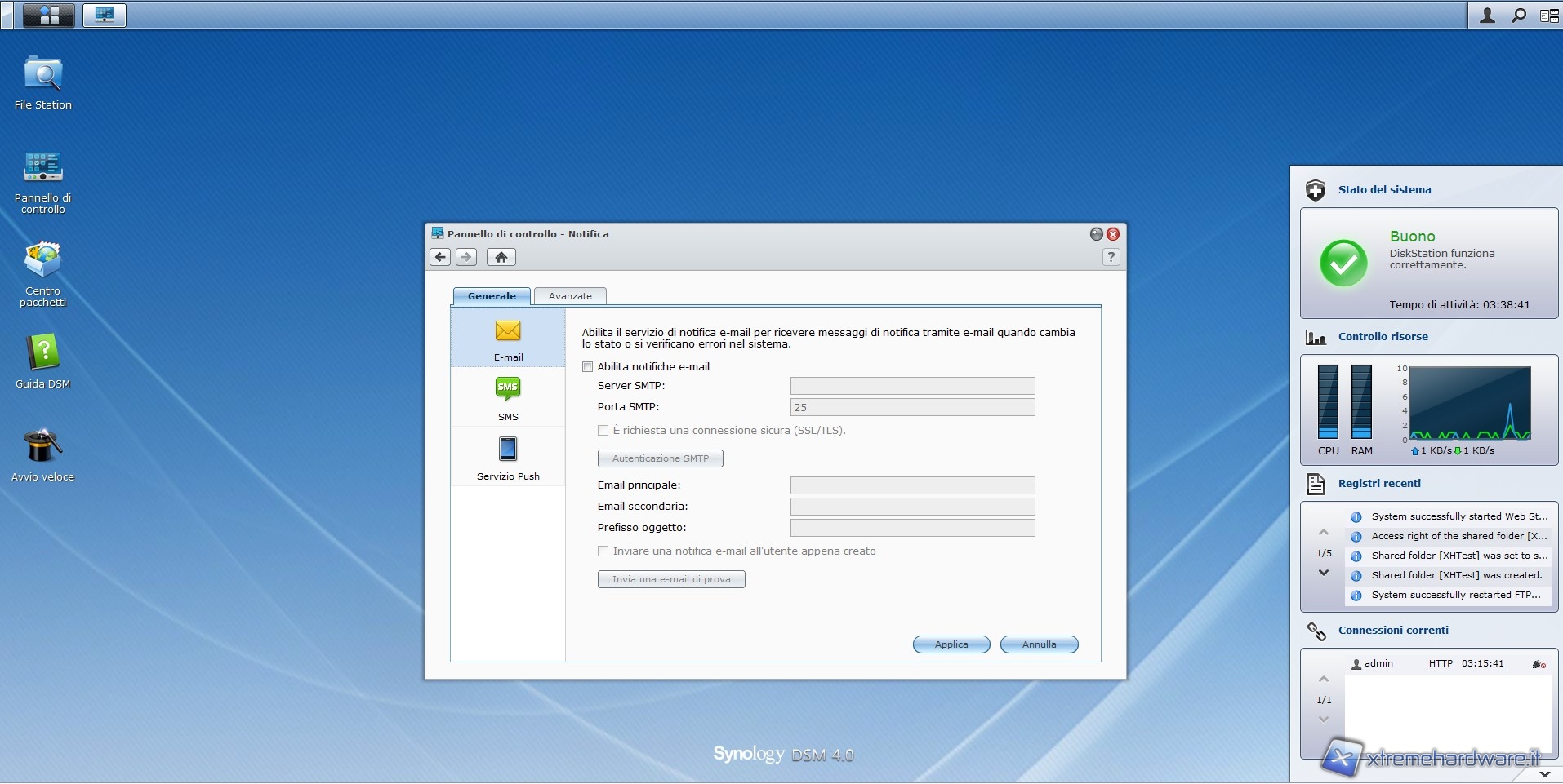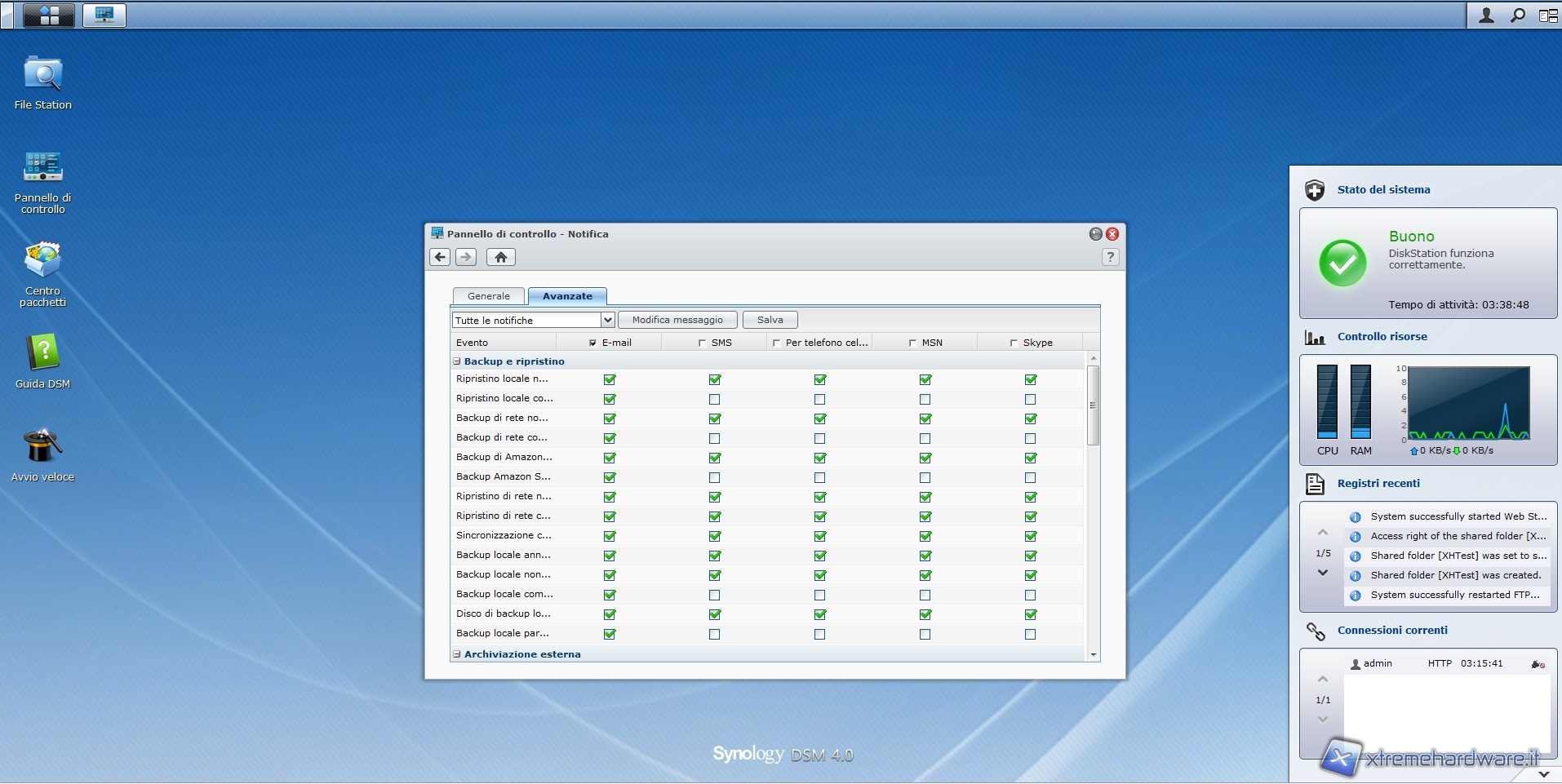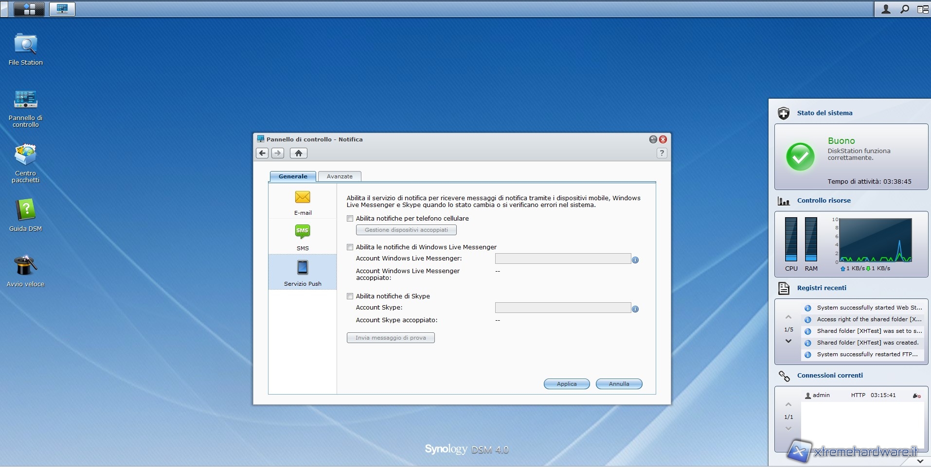 Il servizio di notifica che Synology mette a disposizione dei propri utenti è davvero completo, infatti possiamo rimanere informati su tutti i movimenti e le operazioni effettuate sul sistema tramite email, SMS o Windows Live Messenger/Skype.