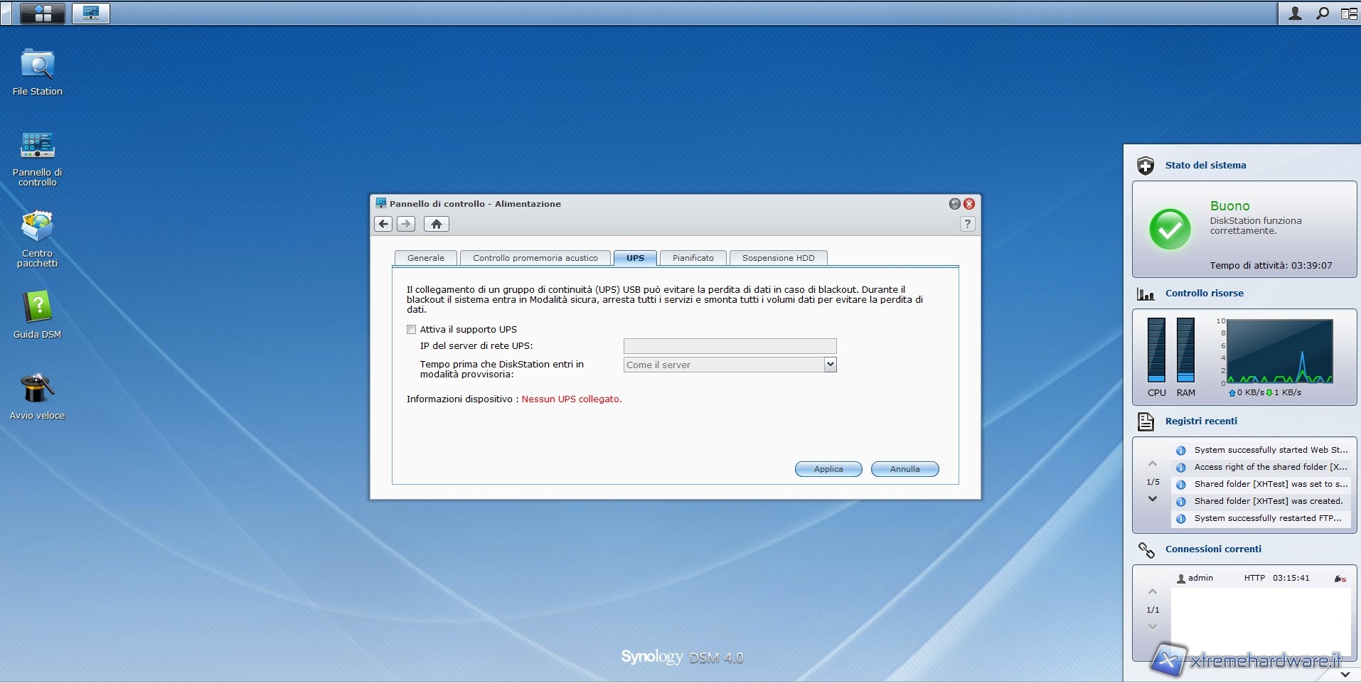 Il terzo tab, “UPS”, prevede l’utilizzo di un gruppo di continuità collegato via USB in grado di entrare in funzionamento in caso di blackout salvaguardando i dati sensibili all’interno degli hard disk allocati nel DiskStation.