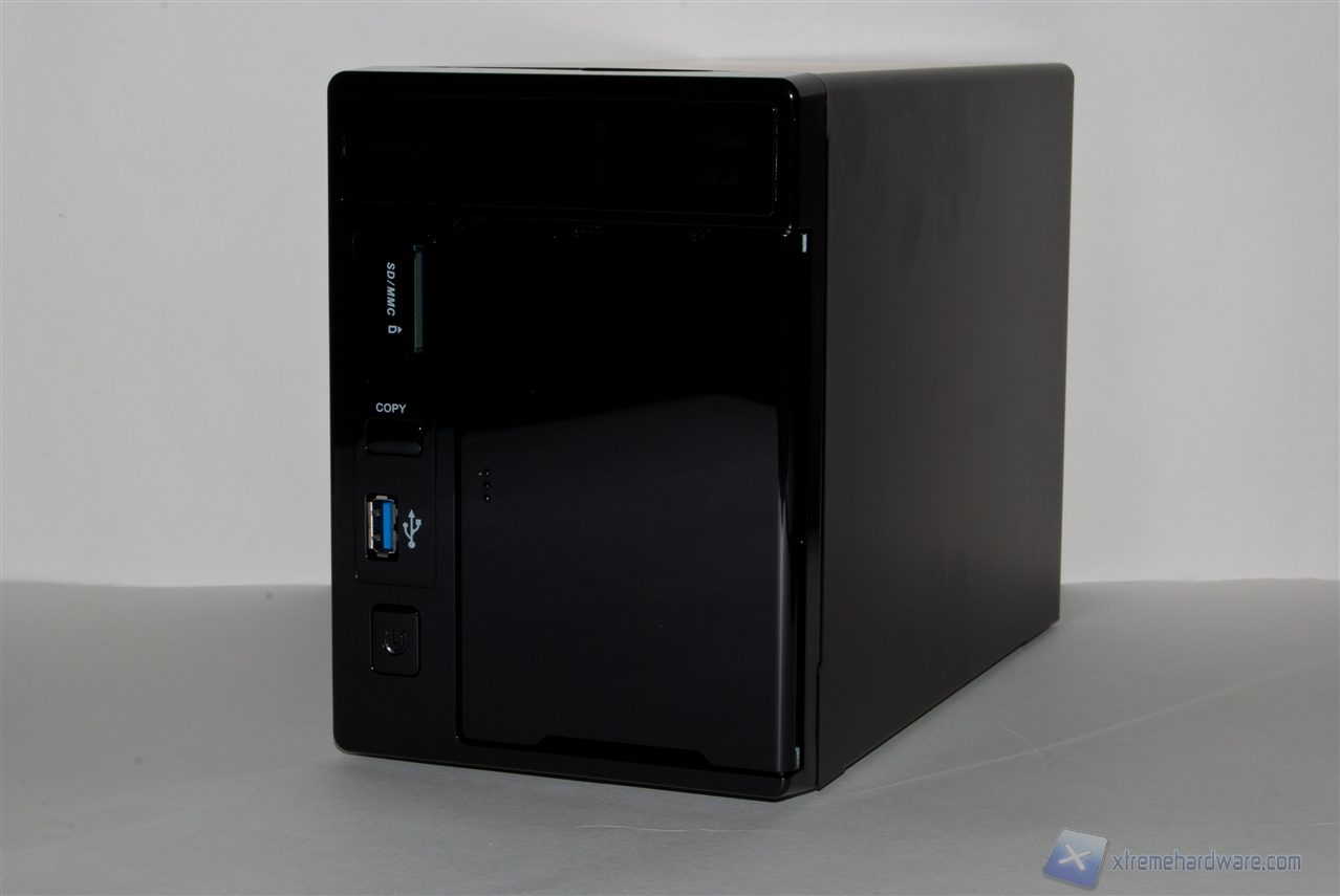 Il frontale, pulito ed elegante, presenta il tasto di accensione, un ingresso USB 3.0, il tasto di copia veloce del contenuto USB/memorie, il lettore di schede SD/SDHC/MMC ed uno schermo che si illumina in fase di utilizzo, indicando, oltre al marchio Thecus, l’attività dell’Hard Disk n#1, del secondo disco, l’attivita della rete LAN, della rete WAN e l’utilizzo del card reader o dell’ingresso USB.