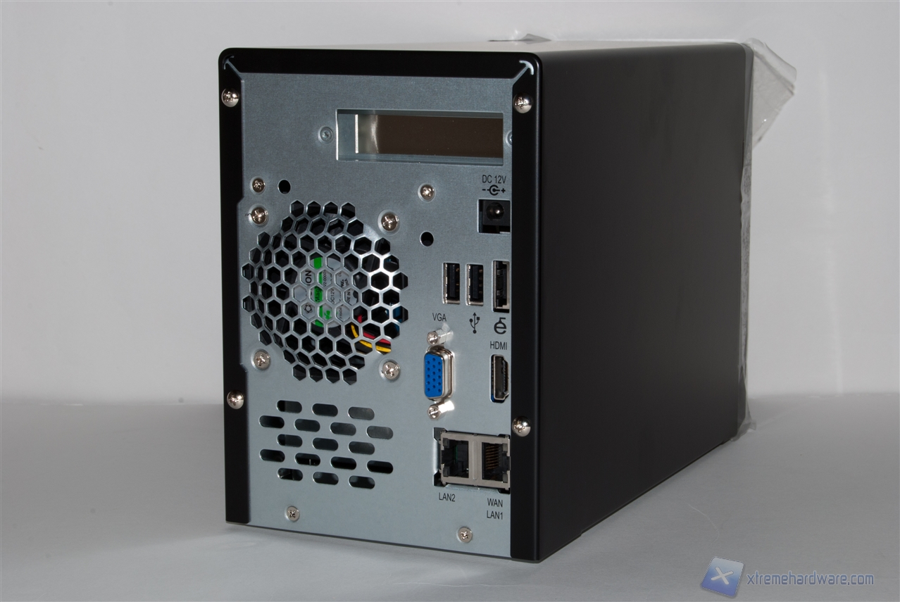 Sul retro del NAS troviamo la ventola da 60mm atta ad estrarre aria calda presente all’interno dello chassis, uno slot di espansione (per PCI-Express), il connettore per l’alimentazione 12V, una porta eSATA, due porte USB 2.0, una uscita D-SUB VGA, un’uscita HDMI e due connettori RJ-45 Gigabit Ethernet.